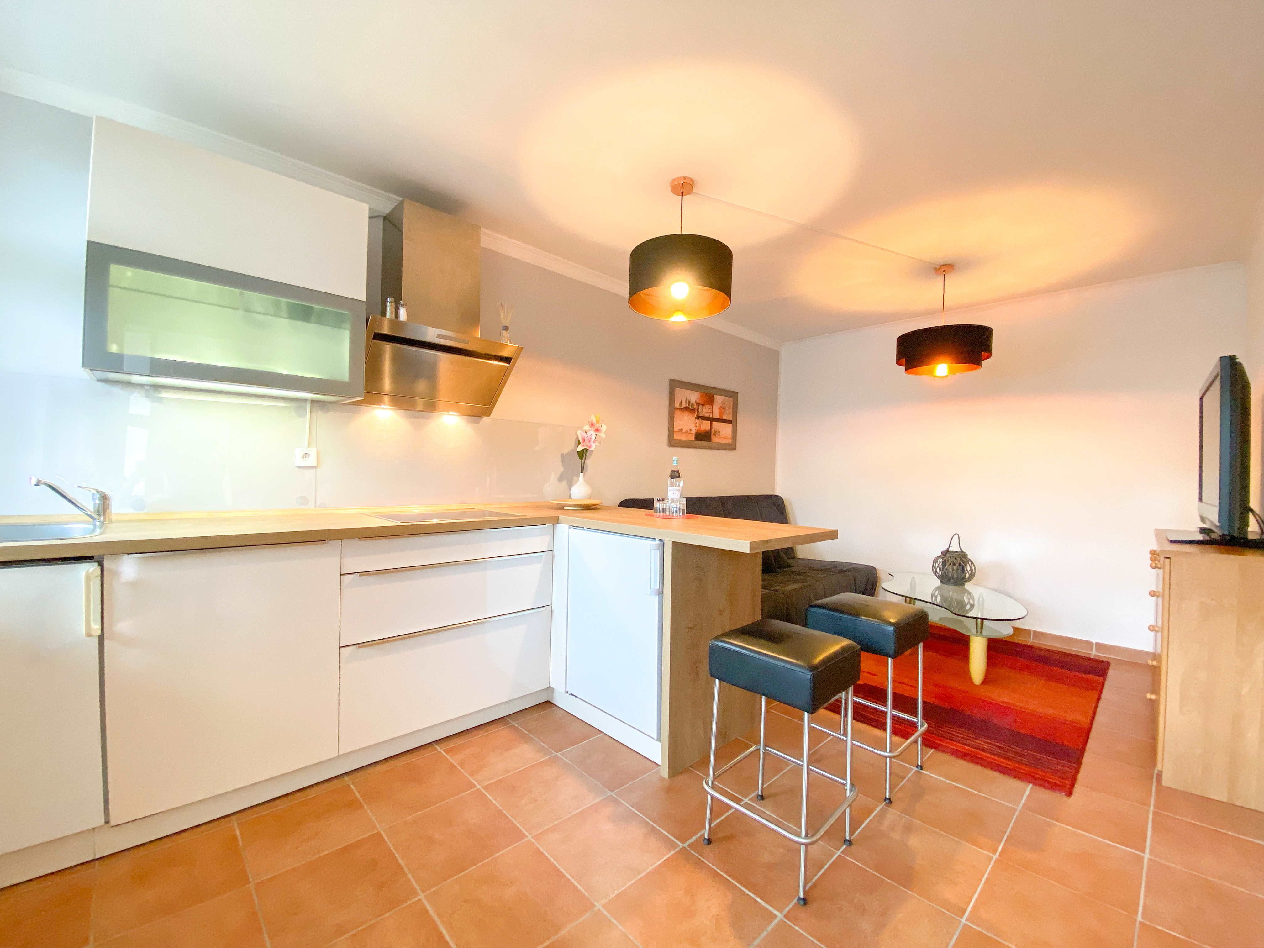 ▸ Wertige Küche: Cerankochfeld, Geschirrspüler, Grundausstattung Kochutensilien, Kühlschrank, Mikrowelle, Kaffeemaschine, Wasserkocher, Toaster, Geschirr, Gläser und Besteck