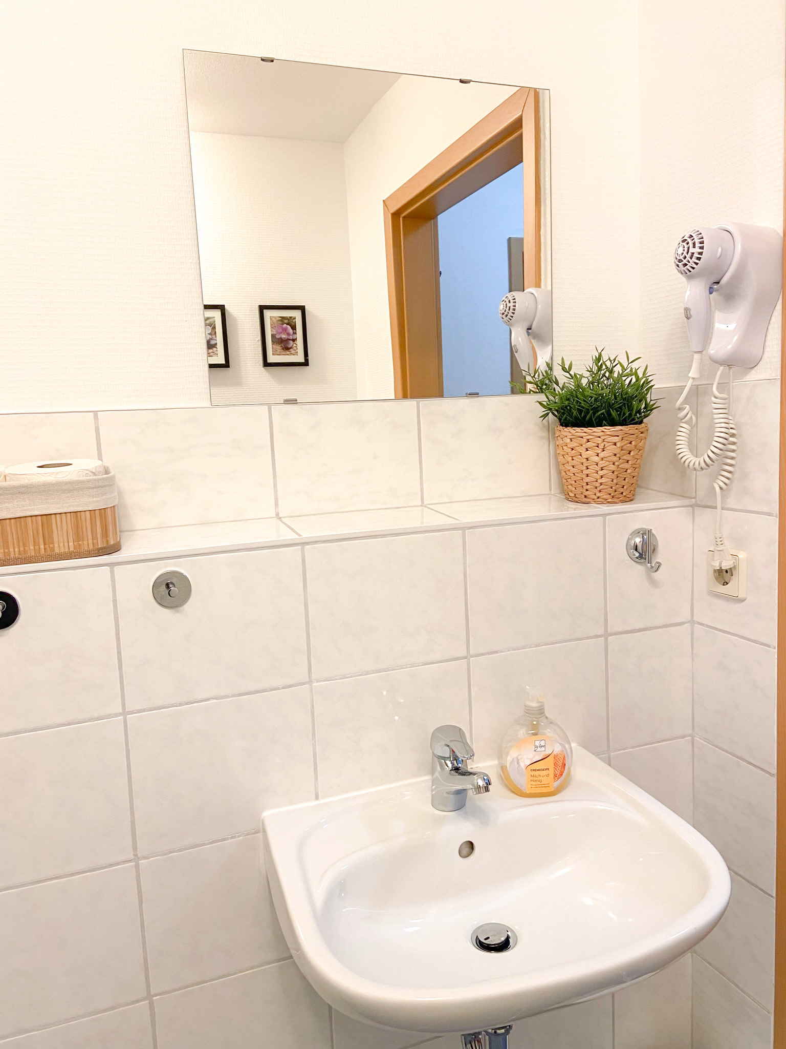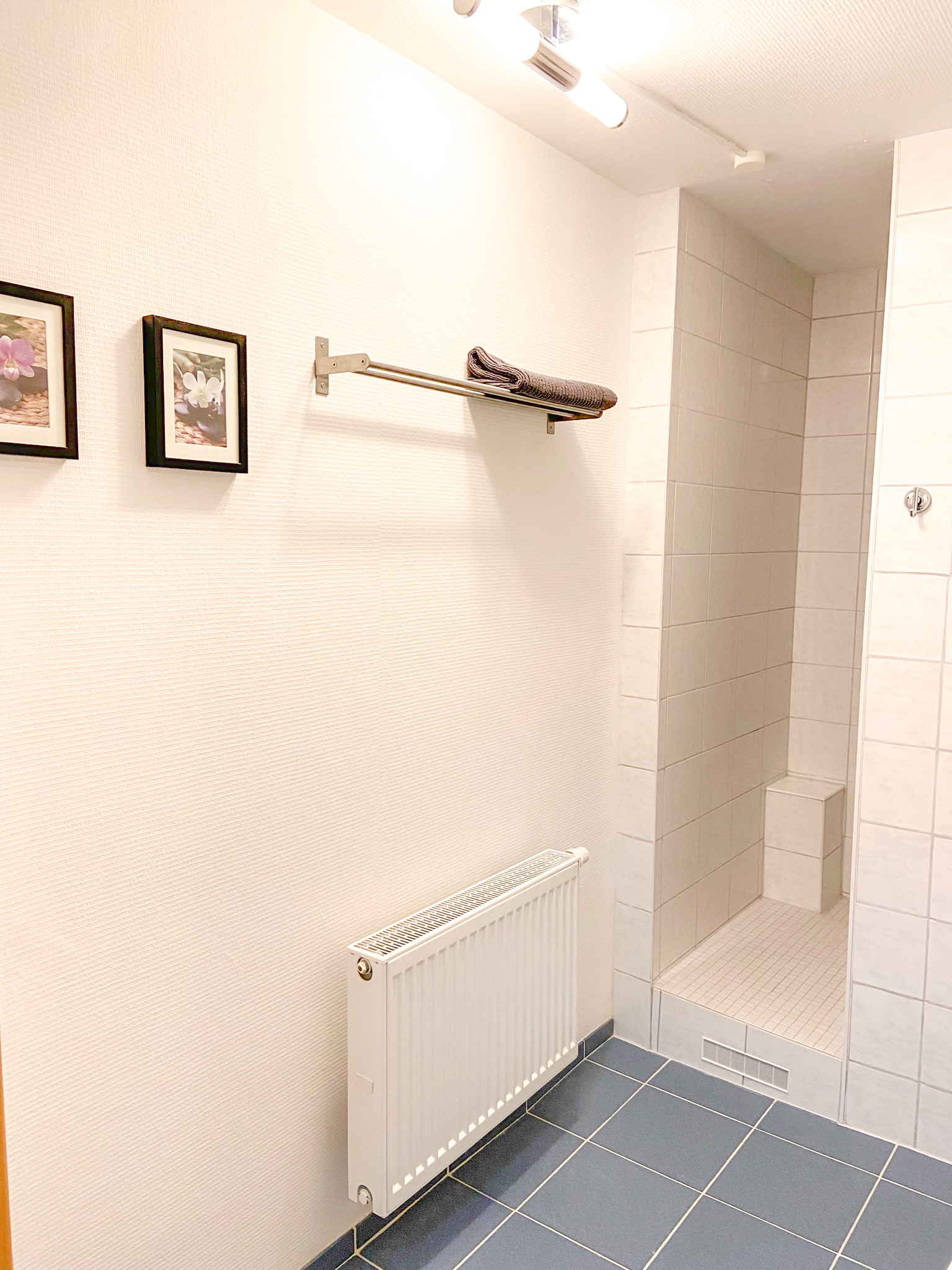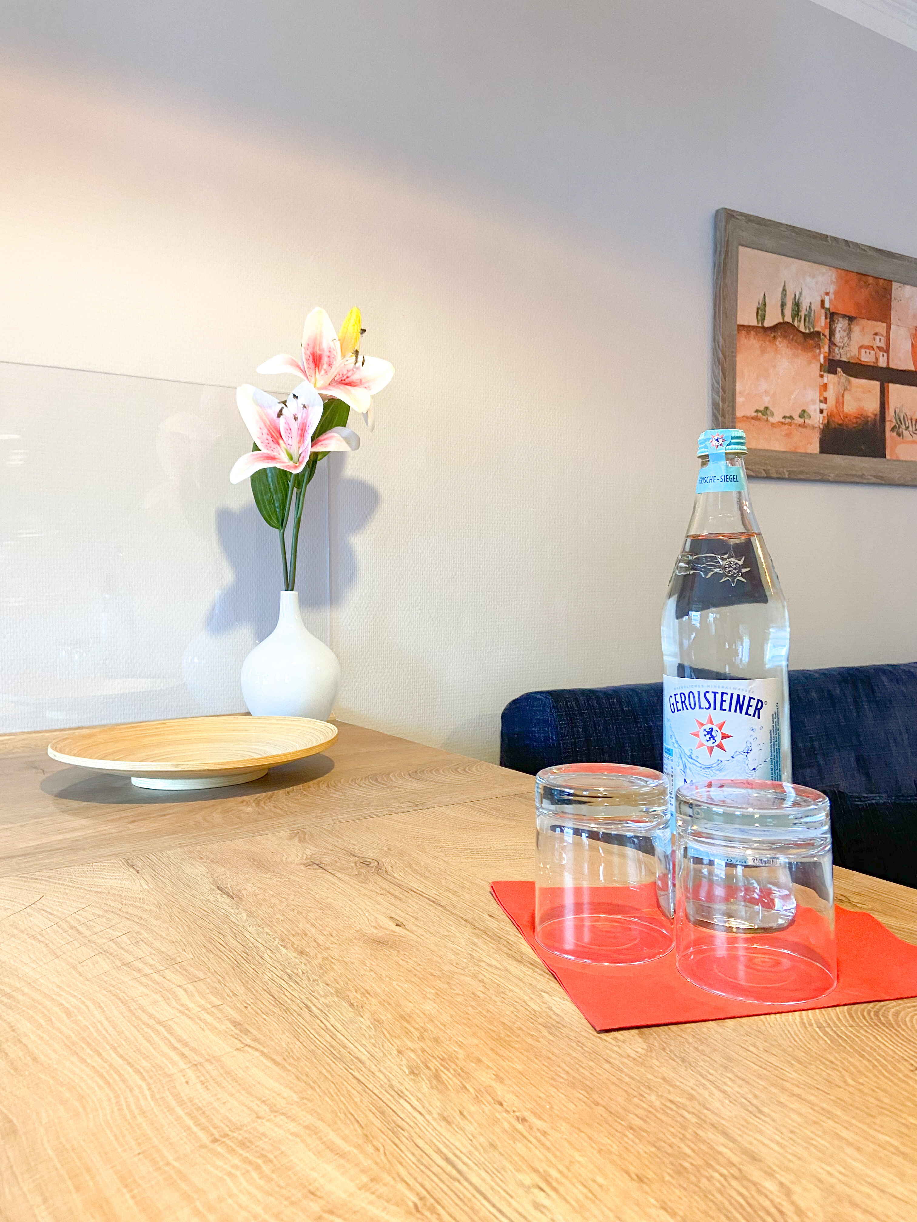 Die Ferienwohnung liegt im Erdgeschoss und ist aufgrund einer zusätzlichen Schlafmöglichkeit im Wohnraum auf bis zu drei Personen ausgelegt. Die Räume sind unterteilt in einen Wohnraum mit moderner Küche und Tresen, einem Schlafraum und einem Bad mit offener Dusche. Zur Ferienwohnung gehören ein PKW-Parkplatz und ein abschließbarer Fahrradraum.